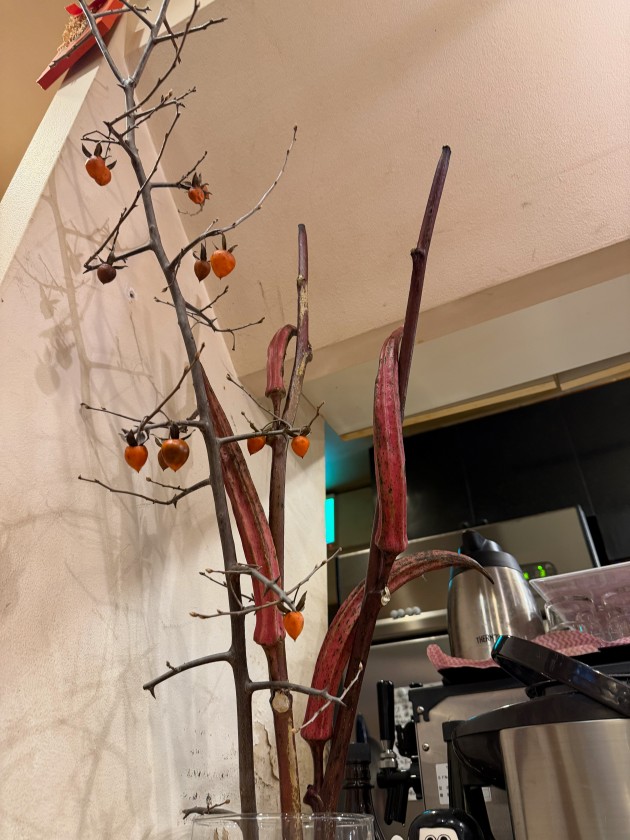 今日のお花は「老爺柿(ろうやがき)おくら」。ダンナが小さい身を食べる。「あっ、柿の味がする」って。こんなのをつまみ食いするのはダンナくらいなものでしょうね。