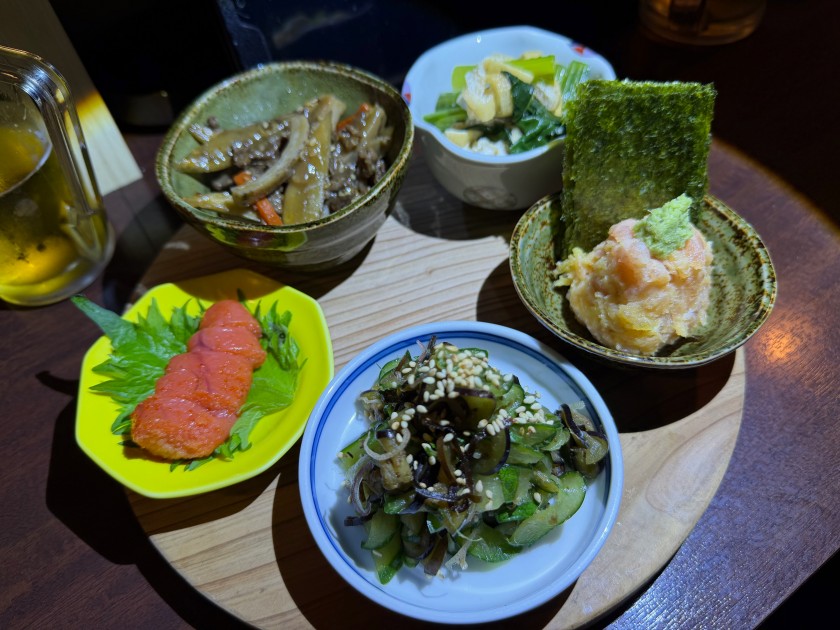 小鉢5品(小松菜キツネ煮、茄子とキューリ塩昆布和え、牛肉とレンコンゴボウキンピラ、トロタク、明太子)。