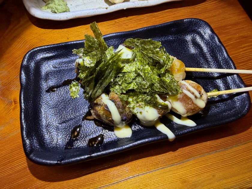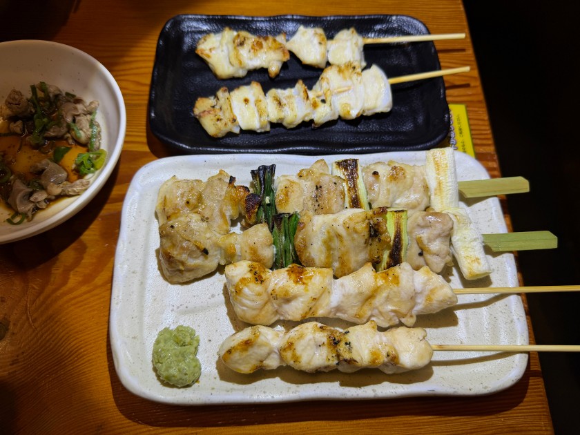 焼き鳥(ささみ塩焼ーわさび添えー、もも貴族焼塩、やげんなんこつ)。