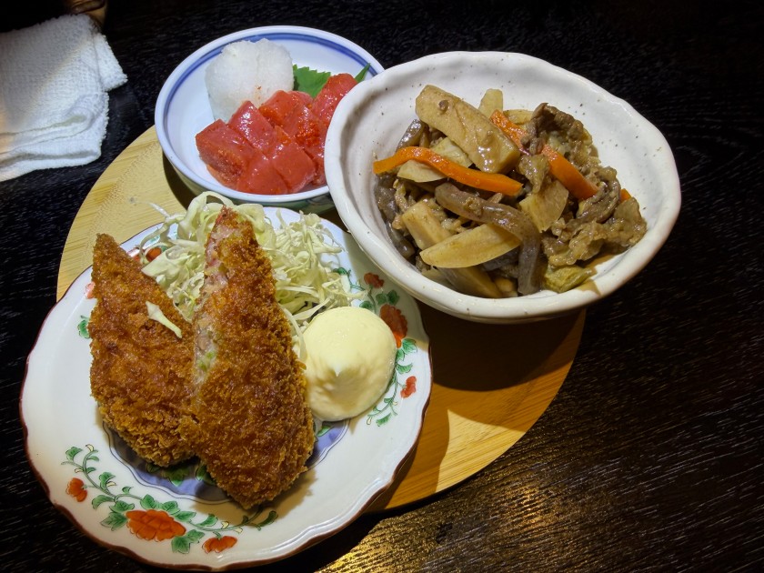 小鉢盛り!! 3品(イカメンチ、牛肉とレンコン・ゴボウ・キンピラ、明太子)。