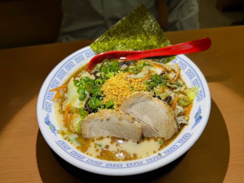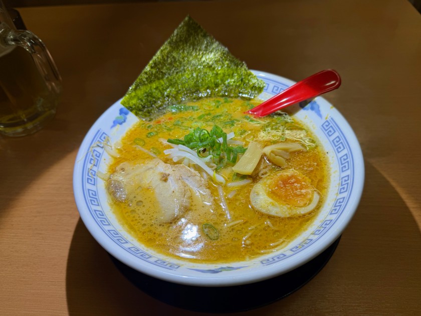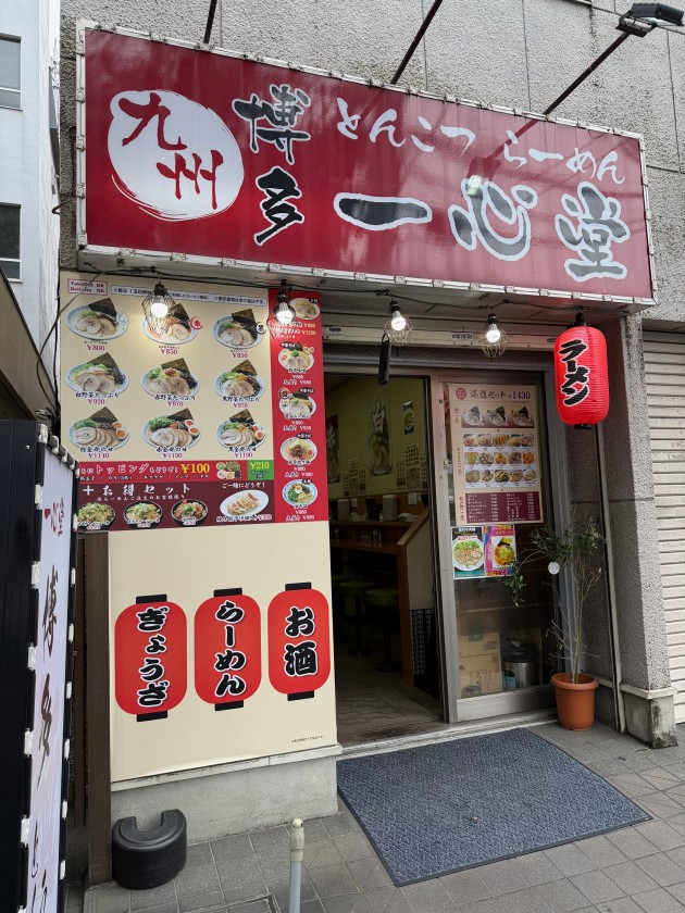 博多らーめん 一心堂@新中野 ランチは「博多らーめん 一心堂 新中野店」さん。 生ビールお願いします! 私は(初めて食べる)味噌ラーメン、850円。「麺は細めで半分」をお願いしました。ウン、美味しい! 玉子も入ってる。 ダンナは「黒ラーメン」に野菜のトッピング、麺は硬め。