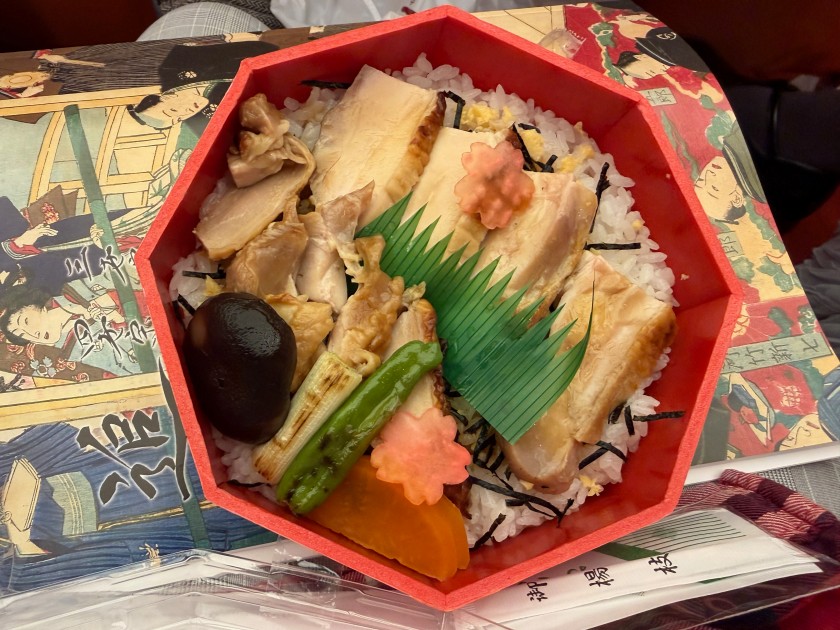 幕間に「焼き鳥弁当」、1,500円を頂きます。すぐ次のプログラムが始まるので、半分食べて、また、次の幕間に半分を頂きました。