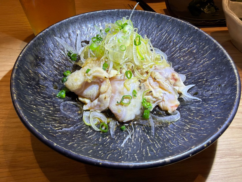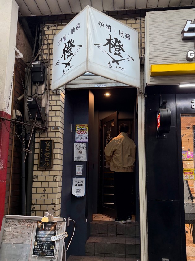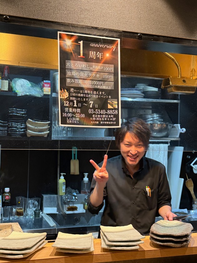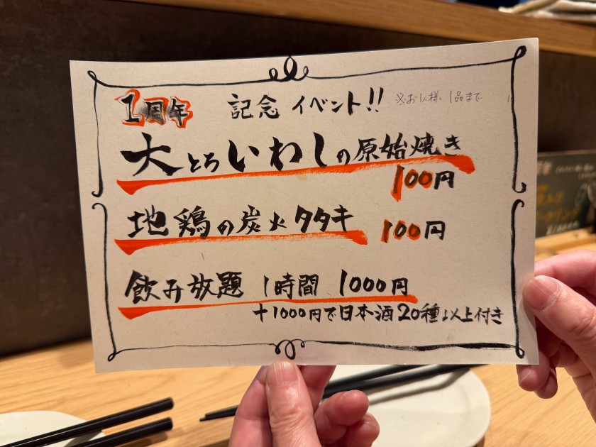 炉端と地鶏 橙 あいべ@新中野 「炉端と地鶏 橙 あいべ」さん、4度目。今週は一周年記念だ! ふふふ、店長さん?かな? こちらが1周年のメニュー。1時間飲み放題をお願いする。1時間1,000円。飲み放題用のメニューがある。 生ビールお願いします! お通し。 子持ち昆布。 生ゆばのおひたし。 自撮りの炭火タタキ。なんと、これが100円! ハイボールお願いします。私は濃いめ。 大とろいわしの原始焼き。これも100円! 鶏白湯(とりぱいたん)ラーメン。 締めは、焼きおにぎり(いくら)。 赤ワインも頂きます! 美味しいです!