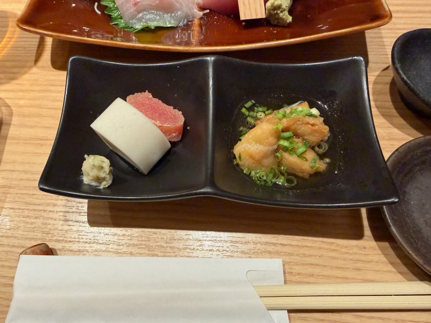テーブルには並んでいます。のどぐろ入りお造り三種。