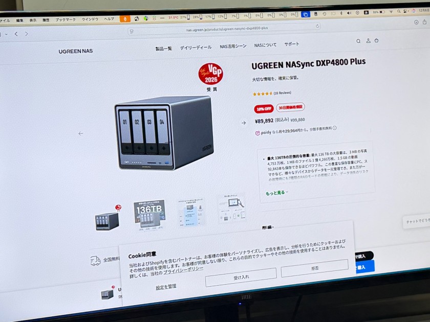 そしてバックアップ用にNASを導入したそうです。「UGREEN NAS Sync DXP4800 Plus」を72,000円で購入。万端ですね!