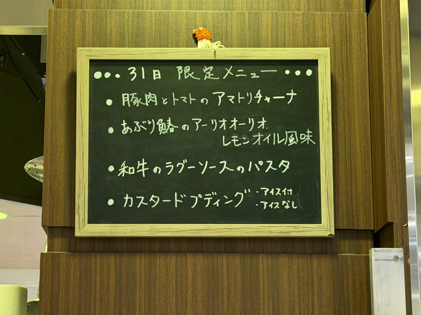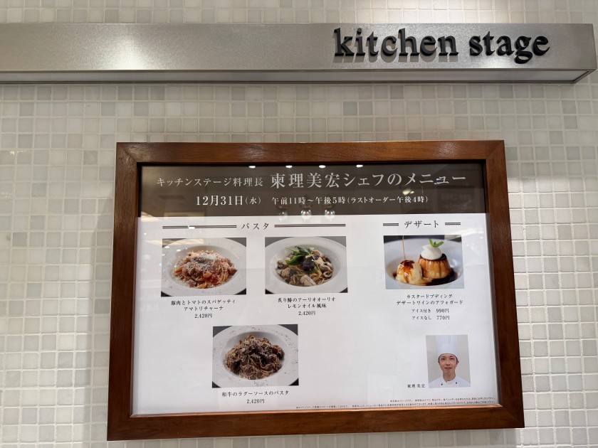 キッチンステージ@伊勢丹 伊勢丹・地下1階の「キッチンステージ」さんに行きましょう。前から入りたいと思っていたお店。 本日のメニューはこちら。いつもは「コース」があるのだが「今日はパスタだけです」と先に説明を受ける。 テーブル席はいっぱいでカウンター席に座る。 ビールお願いします。一人1本。 私は「豚肉とトマトのアマトリチャーナ」。麺は半分に。 ダンナは「あぶり鰆のアーリオオーリオ レモンオイル風味」。美味しいです!