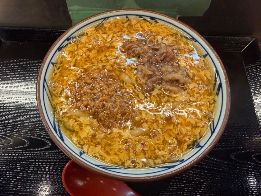 肉がさね玉子あんかけうどん(並)840円。アプリで「30円オフ」を使って810円なり。