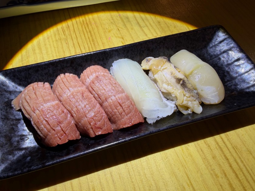 お寿司(まぐろ中とろ・ダンナは2貫、ダンナのつぶ貝2貫、私のほたて)。