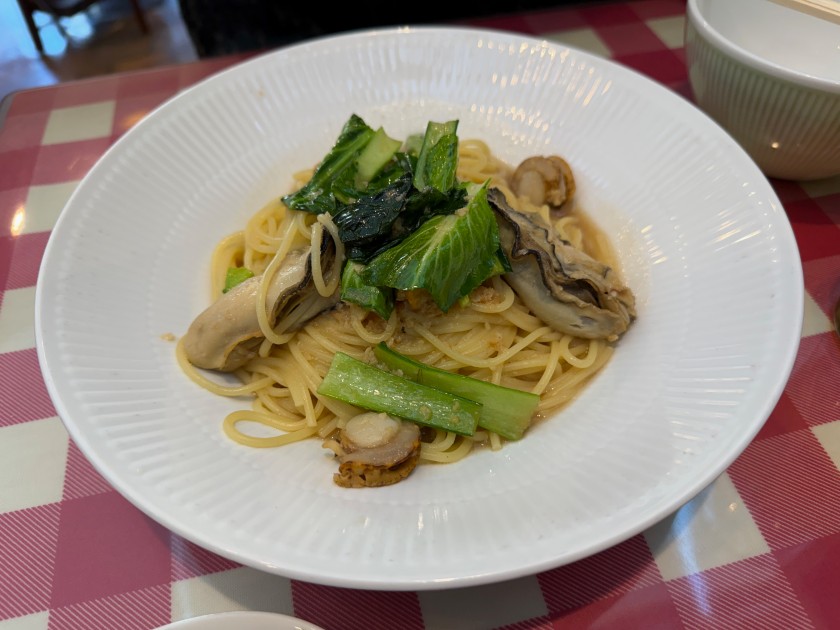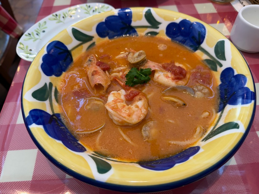 私のパスタ「オマール海老香るブイヤベースパスタ」。麺は半分に。