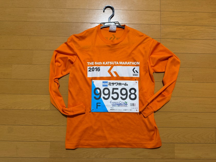 オレンジの長袖Tシャツ。この下にウィンドブレーカーも着ている。