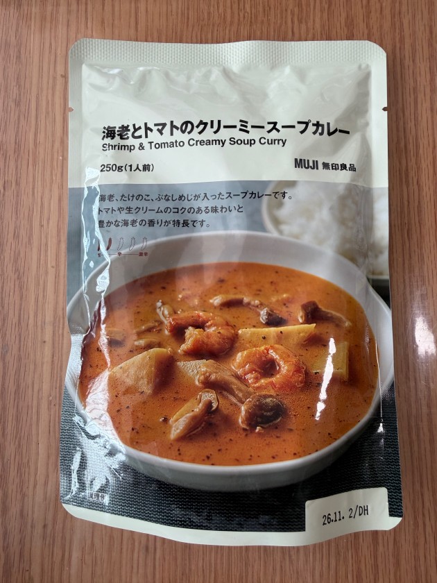 」さんで買った「海老とトマトのクリーミースープカレー」、「2辛」。「250g」と多めだった。買った時は気づかなかったなぁ。美味しいです!