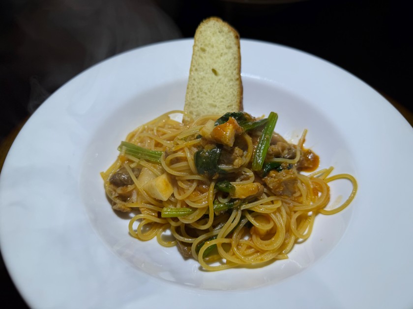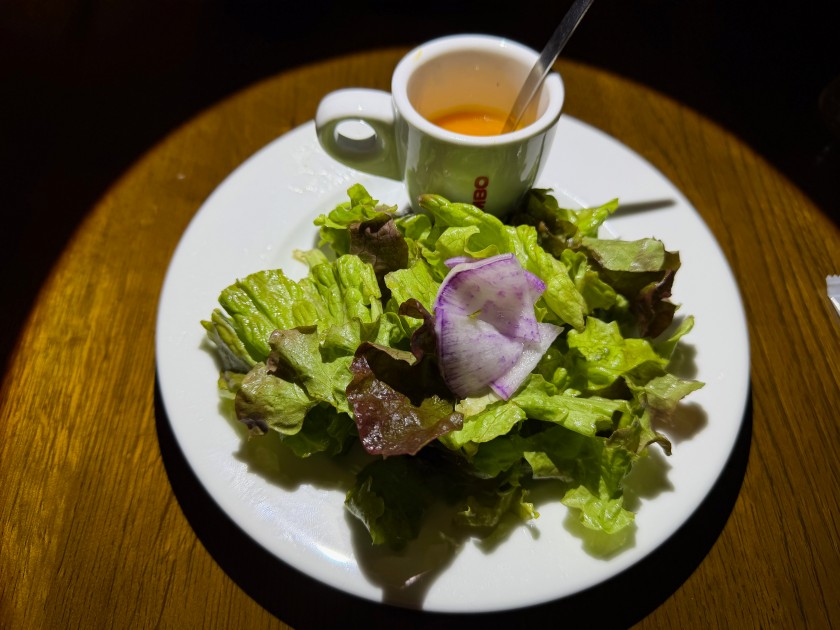Pastatoria ALESSIO(アレッシオ)@新中野 ランチは「Pastatoria ALESSIO(アレッシオ)」さん。桃花小学校のすぐ近く。助かる。 生ビールお願いします! サラダ。あっ、スープが付いている。聞くと「雨や雪の日用」だそうです。「温まるように」と。嬉しい! 私は、鶏モモ肉、カブ、ホウレン草のトマトソース、麺は半分。 ダンナは、アンチョビ、キャベツ、ゴボウのペペロンチーノ。 デザートは、ユズのパウンドケーキ。 アメリカンコーヒー。美味しいです!