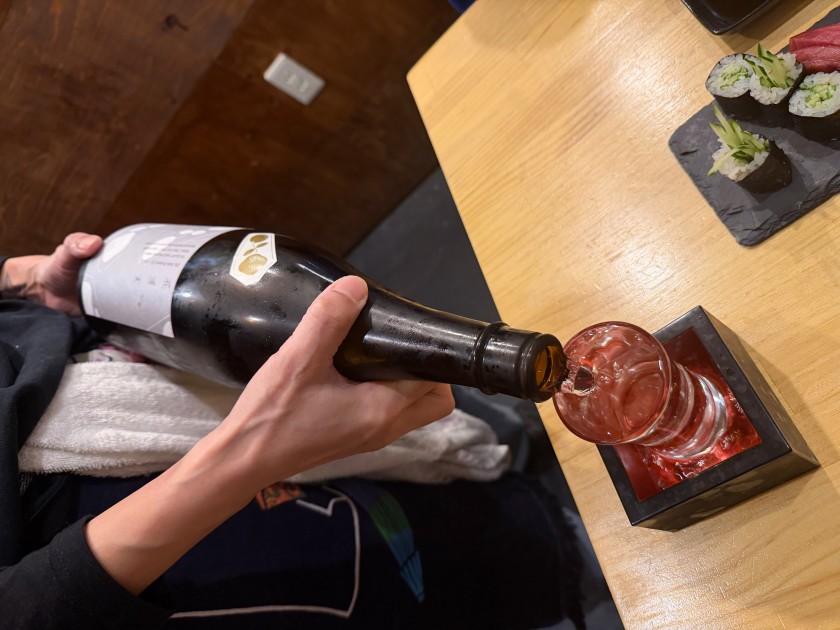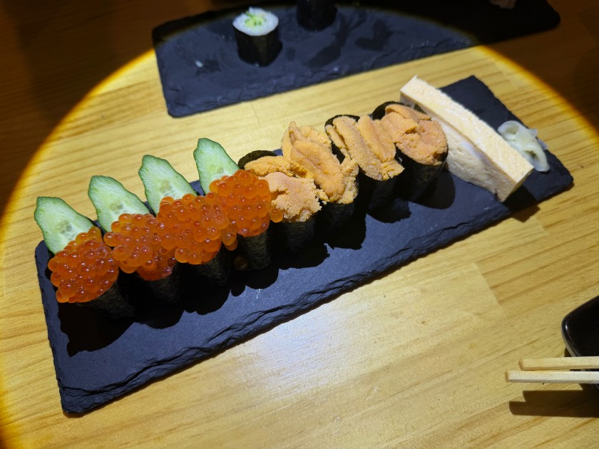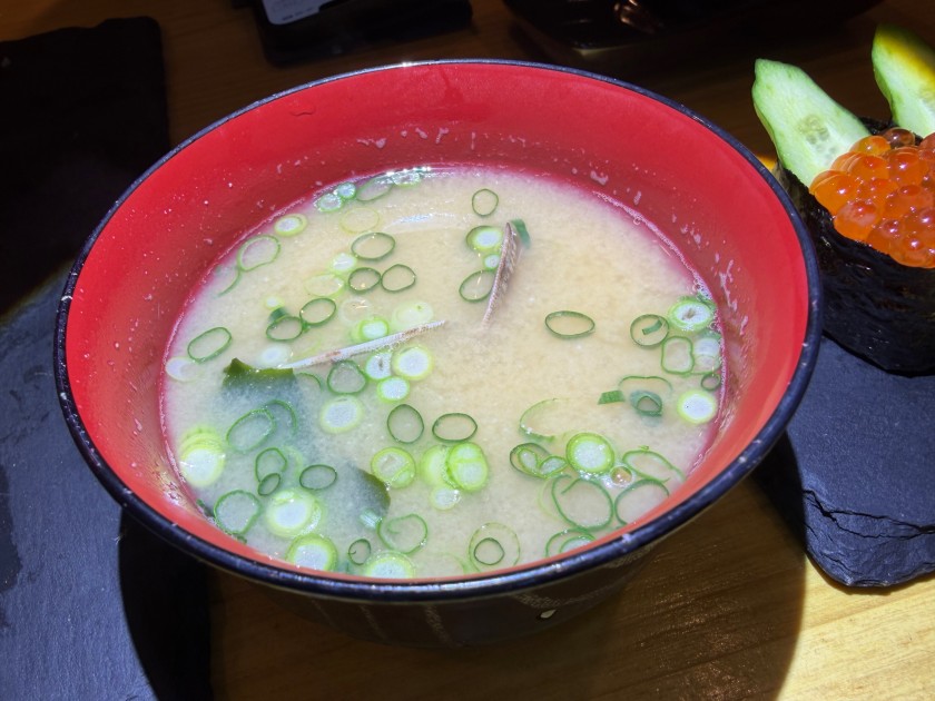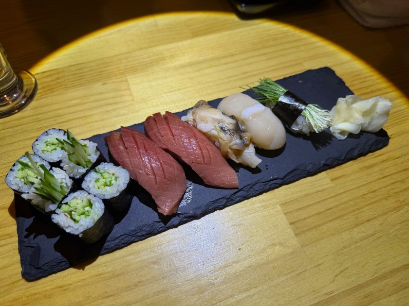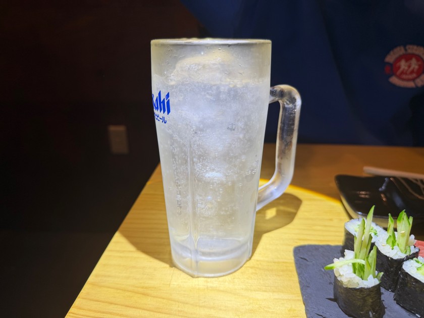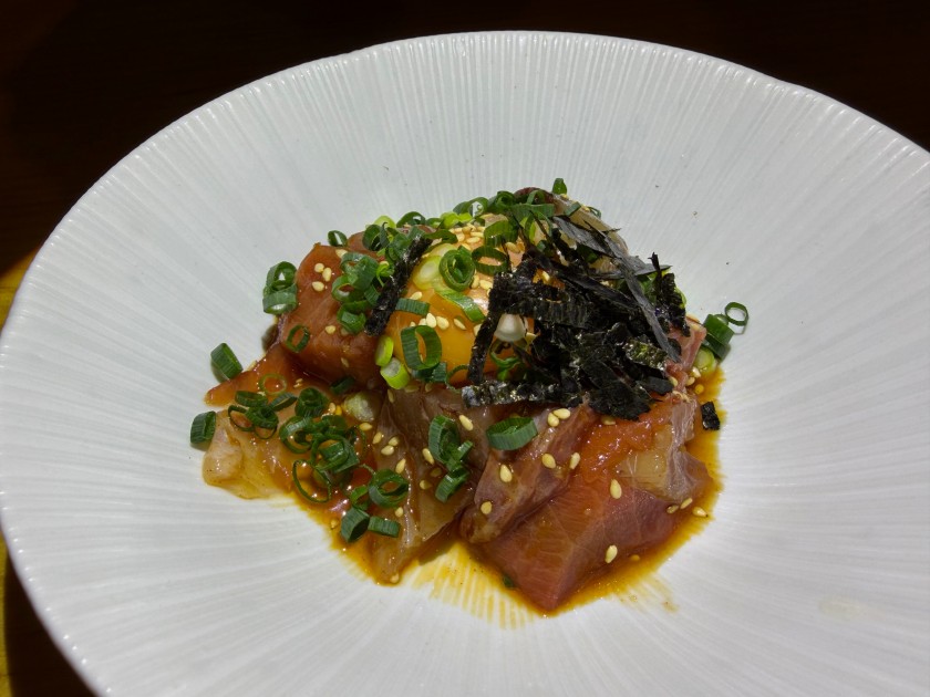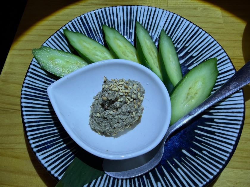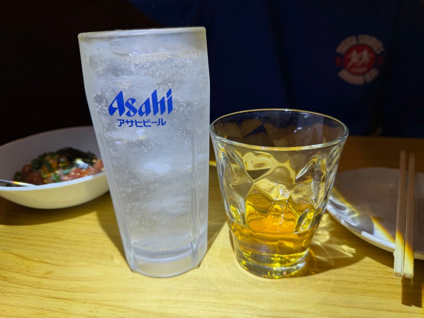 大衆酒場 だるま@新中野 「大衆酒場 だるま」さんに行きましょう。11度目。 私は生ビール(小)、ダンナは生ビール(中)。 お通し。 カニ味噌きゅうり。 ダンナはウィスキー・シングルと炭酸水。 私はウィスキー・ロックに少しだけ炭酸水。 海鮮ユッケ。 お寿司(カッパ細巻、まぐろ中とろ、ダンナのつぶ貝、私のほたて、ダンナの芽ねぎ)。 ダンナは炭酸水のお代わり。 私は日本酒を頂きます。 三重:純米辛口・花芽実(かがみ)1合、988円。旨い。 お寿司(いくら、うに:一人2貫、玉子)。 あさり味噌汁。 流石の金曜日。満席で入れずに帰ったお客様も複数人いらっしゃった。美味しいもんね。