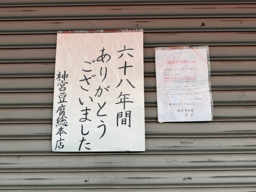 新中野で有名な「神宮豆腐総本店」さん、2月28日(土)で閉店していた。寂しくなります。