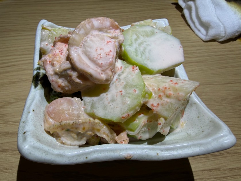 ホタテ ブロッコリーの明太まよ。ダンナは「マヨネーズはよけて食べる」と言っていたが、よけられない。アハハ。私が中心になって食べる。